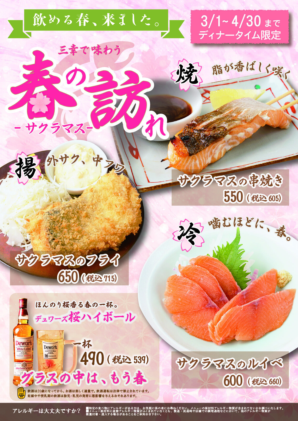 三幸大通ビッセ店で3/1~4/30の期間限定で春を感じるサクラマス料理のフェア開催中!