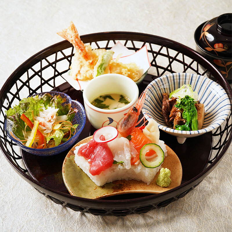 海鮮ばらちらし小丼/雲丹蟹小丼/鮭いくら小井/天ぷら/小鉢/茶碗蒸し/サラダ/椀 -