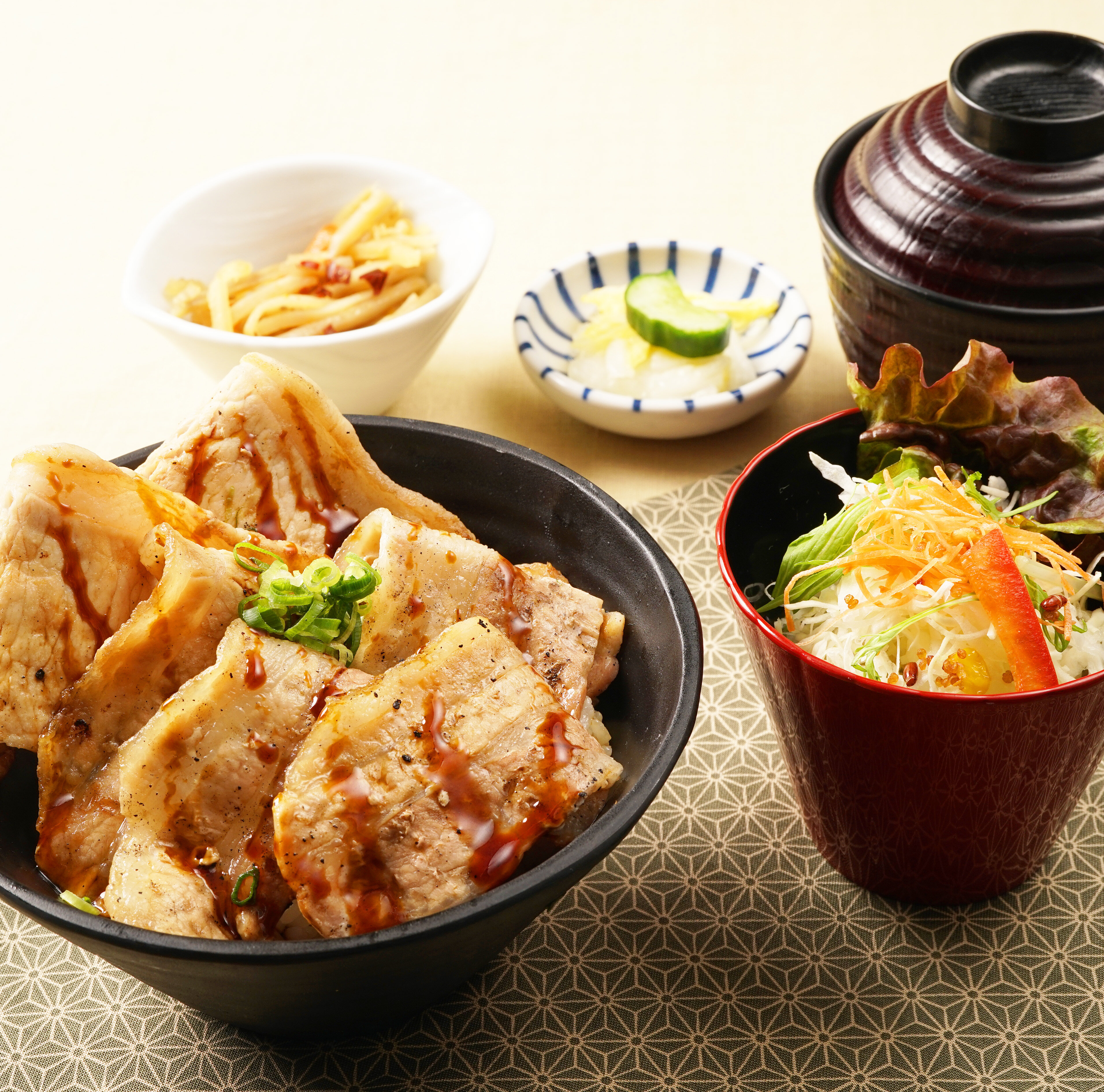 北海道産炭焼豚丼/サラダ/小鉢/香の物/椀