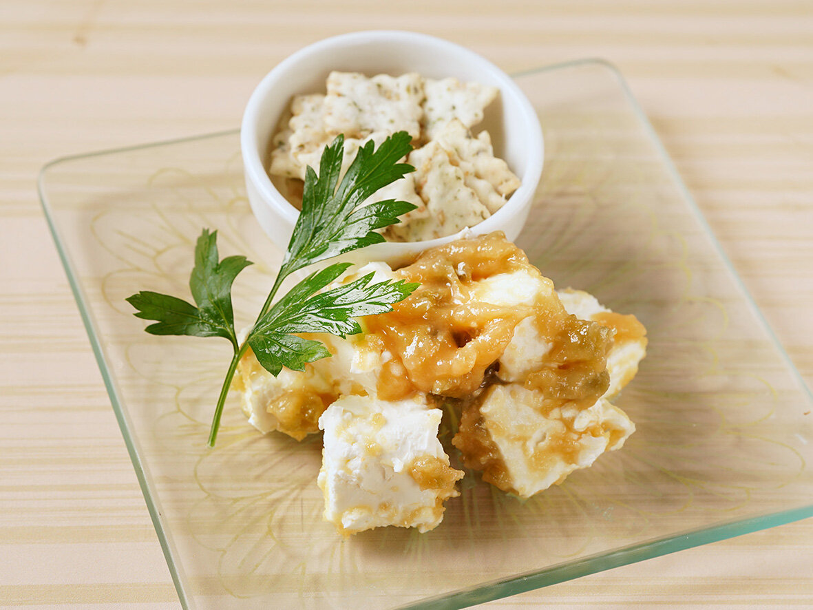 (芽室産枝豆の燻製塩・ラムの生ハム・サラミ・カレー風味のキッシュ・クリームチーズの山葵味噌&山葵クラッカー)