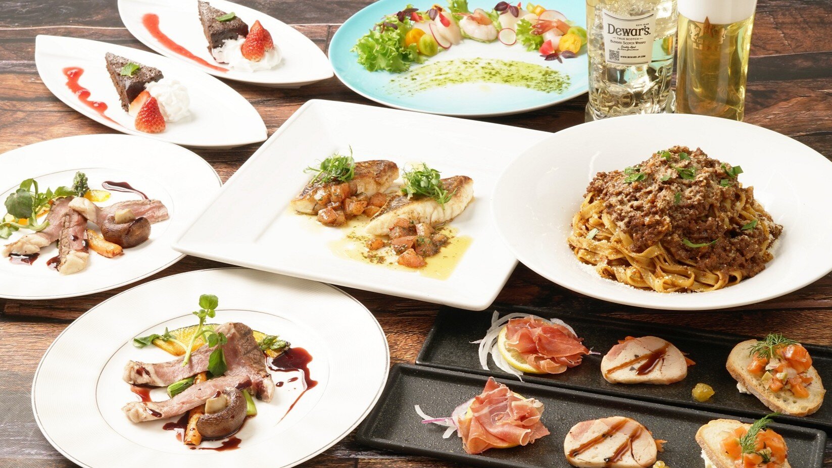 <120分飲み放題付>生ハムやトリュフ香る前菜から始まり、甘エビと帆立のカルパッチョ、真鯛のローストで魚介の旨みを堪能。メインは和牛サーロインのグリル、〆は鹿肉のボロネーゼ。最後はショコラケーキまで揃う、ビヤホールの枠を超えたフルコース仕立ての贅沢プランです